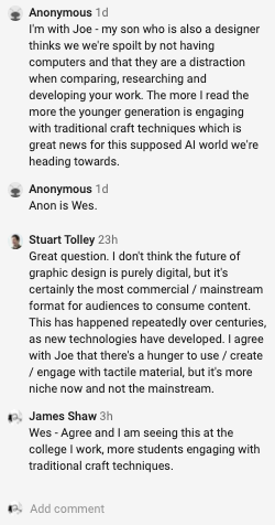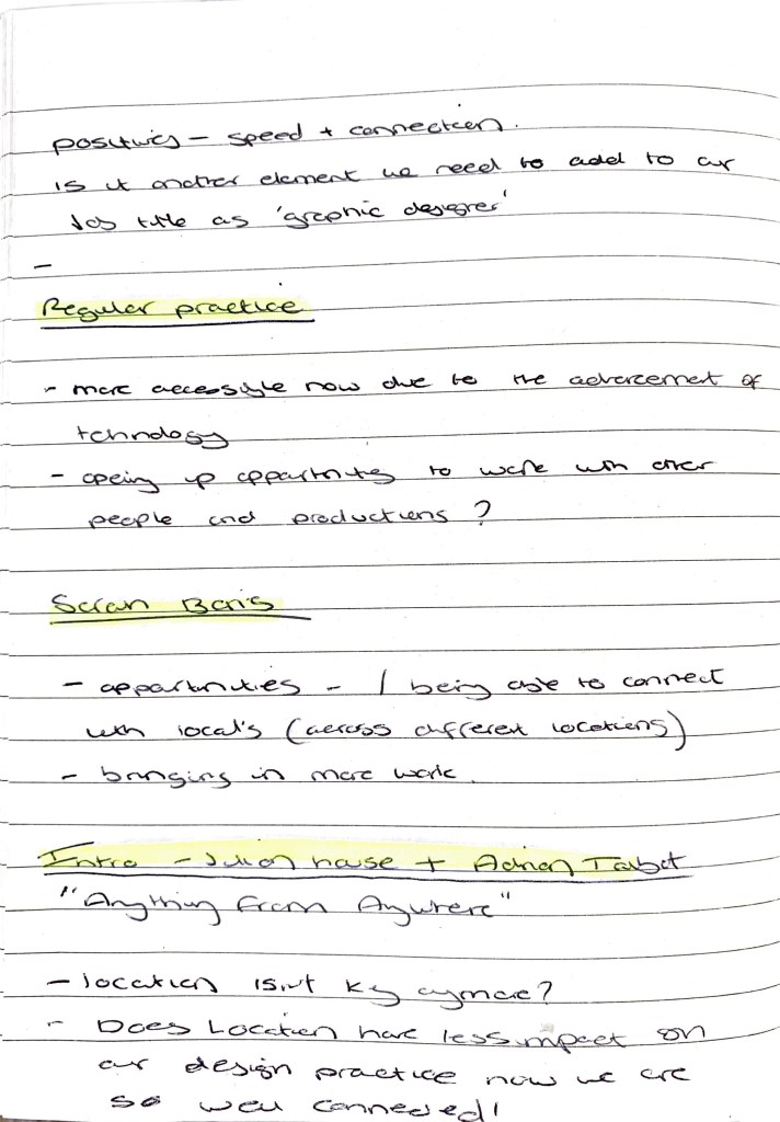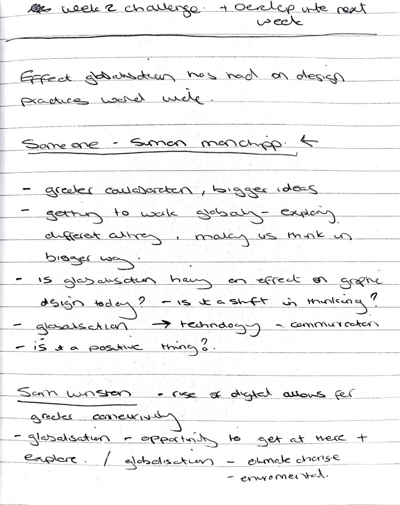 Simon Winston brought up that globalisation can be seen as exploring and getting out there, finding out what’s going on locally and globally, both in physical form and in within communities, news social issues etc. With such easy access to the internet and anything at our fingertips are we forgetting to explore in person. Simply going out for a walk and finding out what’s going on, speaking to people, or is the power of globalisation just making it easier and cost effective? Do we get the same responses from connecting virtually as we do by being there in physical form? Julian House and Adrian Tabot have stuck to face to face meetings in person in London and are yet to adopt this digital connection of meeting online. This could be due to them having all their clients within London. For them is globalisation having less impact on their business? Or are other factors associated with globalisation within design have an impact?