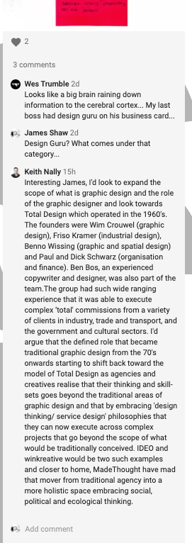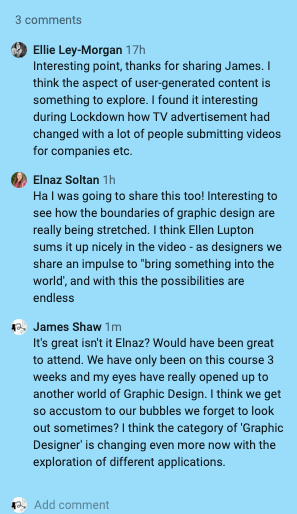 I feel this week I have become more aware of what is going on around me, more open to discussions and confident in sharing my opinion on my practice. Exploring design terminology has made me think about where I am right now and how I want to develop. It’s also made me aware of how saturated the industry is becoming due the advancement of technology… there are so many terms and categories out there but being true to your practice and being willing to learn is so important.