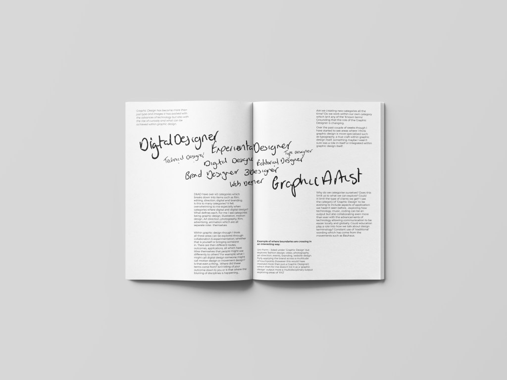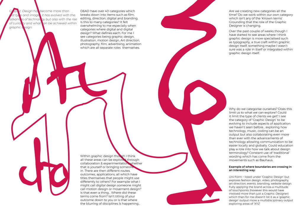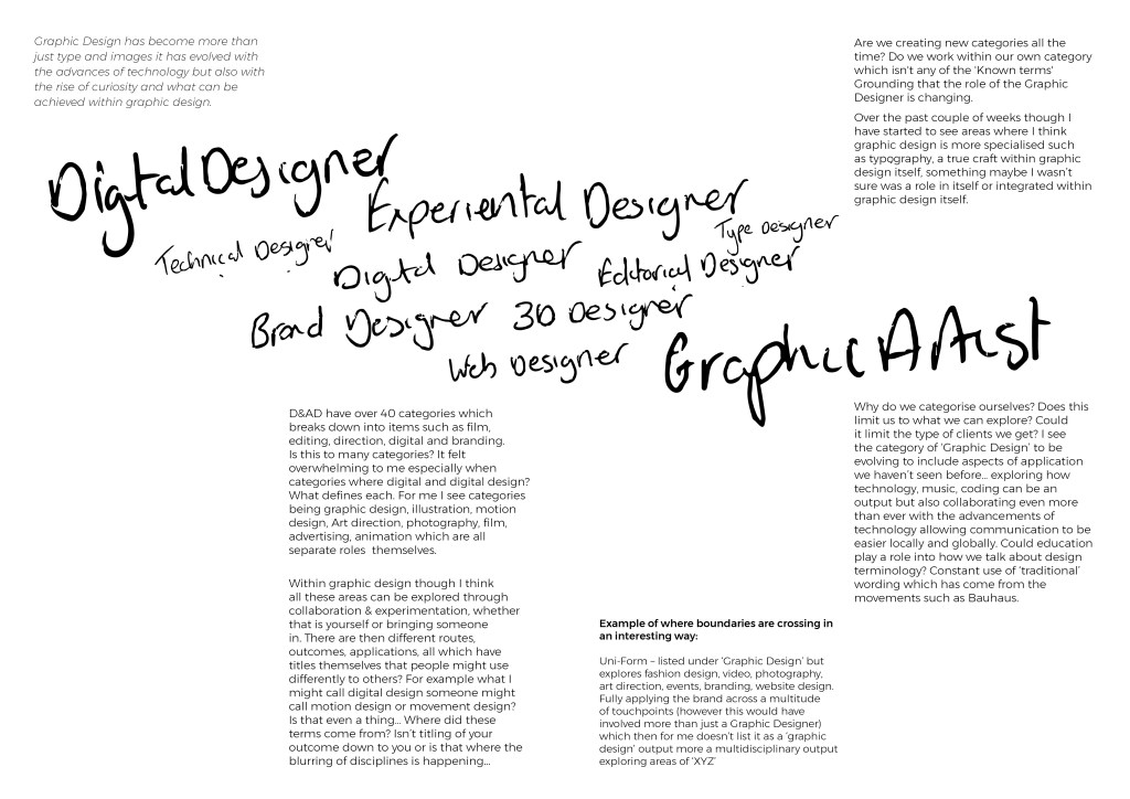 D&AD have over 40 categories which breaks down into items such as film, editing, direction, digital and branding. Is this to many categories? It felt overwhelming to me especially when categories where digital and digital design? What defines each. For me I see categories being graphic design, illustration, motion design, Art direction, photography, film, advertising, animation which are all separate roles themselves. Within graphic design though I think all these areas can be explored through collaboration & experimentation, whether that is yourself or bringing someone in. There are then different routes, outcomes, applications, all which have titles themselves that people might use differently to others? For example what I might call digital design someone might call motion design or movement design? Is that even a thing… Where did these terms come from? Isn’t titling of your outcome down to you or is that where the blurring of disciplines is happening… Are we creating new categories all the time? Do we work within our own category which isn’t any of the ‘Known terms’ Grounding that the role of the Graphic Designer is changing.