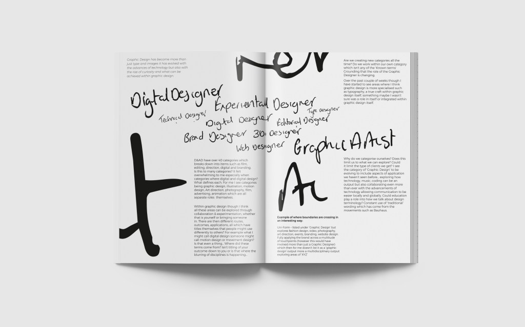 Why do we categorise ourselves? Does this limit us to what we can explore? Could it limit the type of clients we get? I see the category of ‘Graphic Design’ to be evolving to include aspects of application we haven’t seen before… exploring how technology, music, coding can be an output but also collaborating even more than ever with the advancements of technology allowing communication to be easier locally and globally. Could education play a role into how we talk about design terminology? Constant use of ‘traditional’ wording which has come from the movements such as Bauhaus.