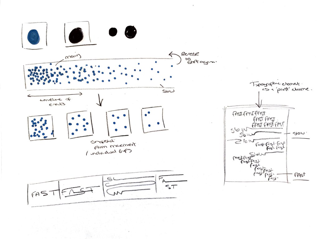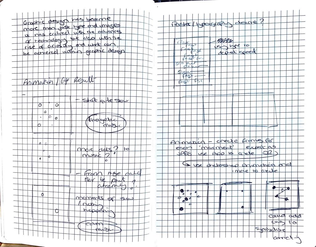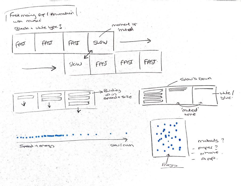Starting to explore the final outcome for this week’s challenge. Initial sketches into how i might construct a moving image/ GIF/ Animation. Choice of direction from the values chosen and ‘self’ state I am in. Thinking if I use shapes to depict the speed (circles. rectangles) or using more obvious typographic references (fast, slow, ,muted)