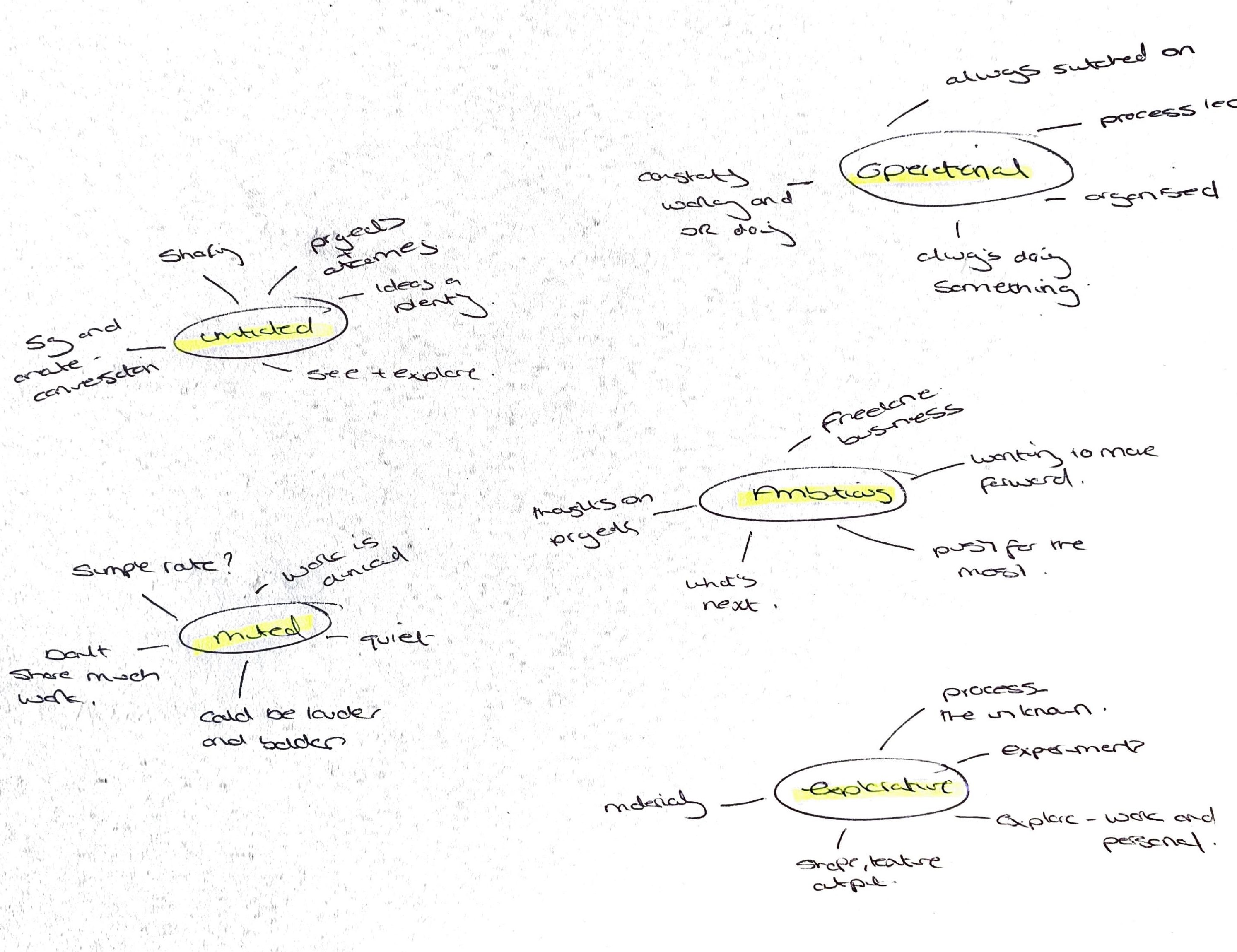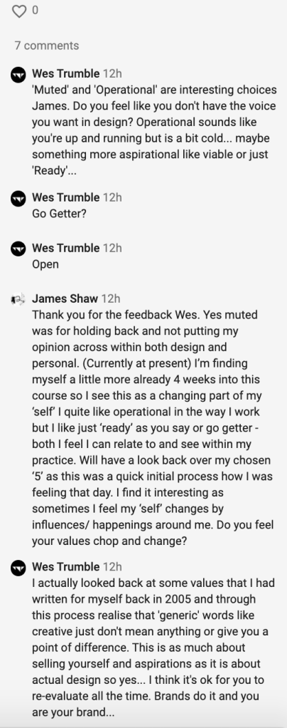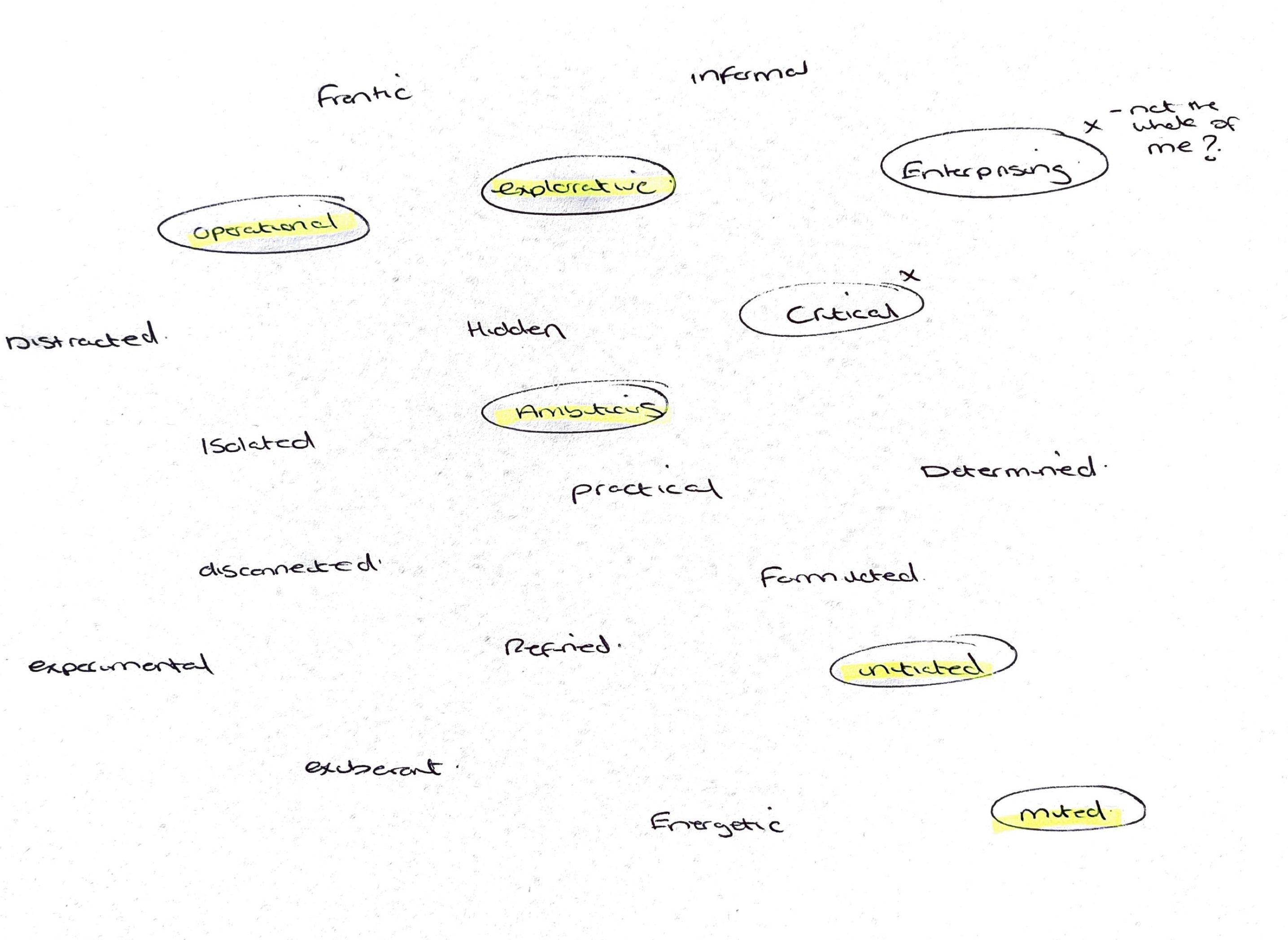 Feedback from ideas wall: Wes mentioned and highlighted about two of the words I had chosen, Muted & Operational. He made a good point around operational being quite cold and after further thought I am not sure this word captures what I wanted. I want to capture how I am alway’s on the go, alway’s exploring, working, finding. I am going to revisit this word to find a better suited value. I do however quite like muted as it sits with where I am right now, not 100% confident in where I am in my practice plus I am quite a quiet individual overall and keep myself to myself.