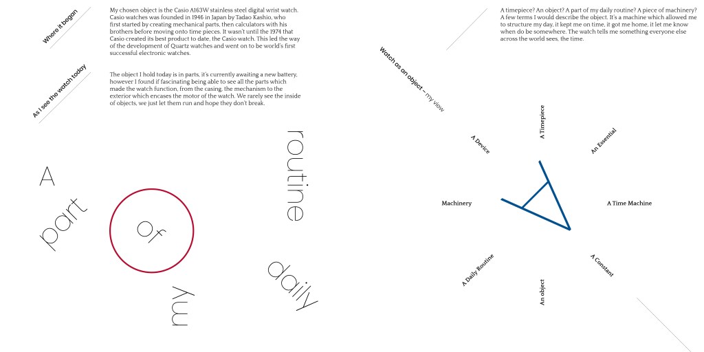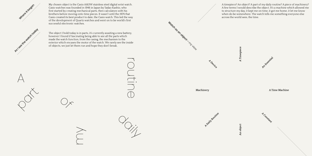 Continuing to develop my editorial for this week’s challenge. I am excited by how this is starting to develop into a stand alone design piece, it almost feels like a deconstruction of precis, like my object. Could I look into removing all the imagery and just working with typography? Or does it need the imagery for balance?