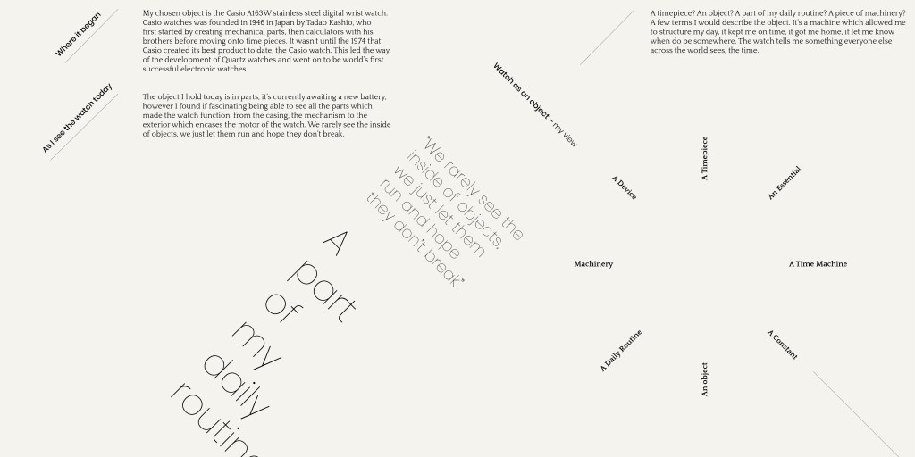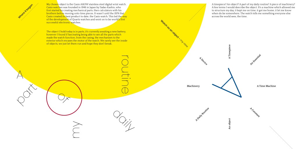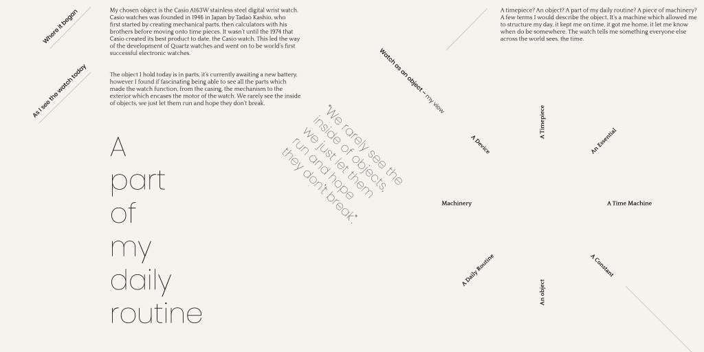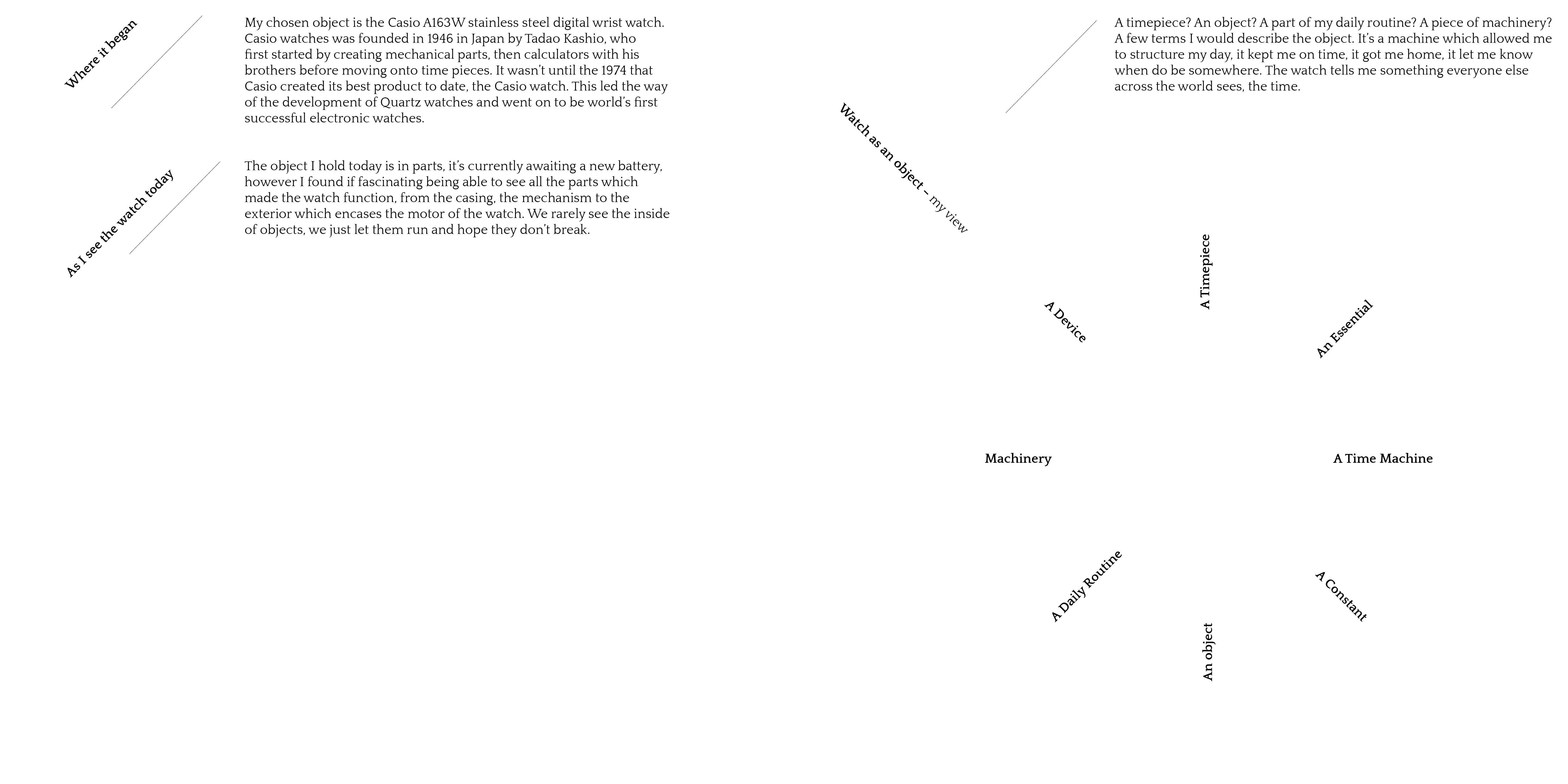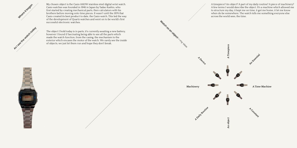 A timepiece? An object? A part of my daily routine? A piece of machinery? A few terms I would use to describe the object. It’s a machine which allowed me to structure my day, it kept me on time, it got me home, it let me know when to be somewhere. The watch tells me something everyone else across the world sees – the time.