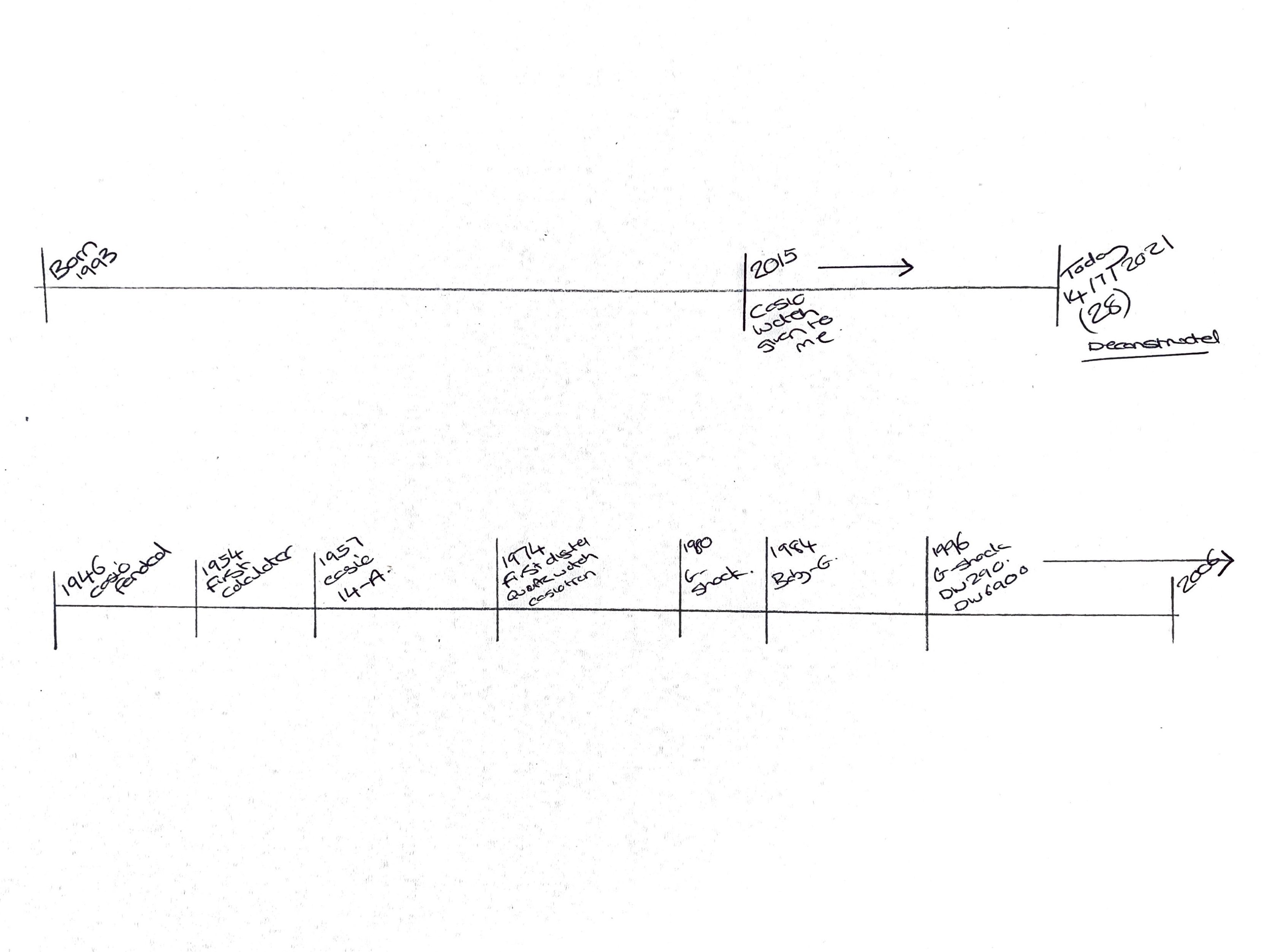 Below – The timeline of my life and where I first acquired the Casio watch (2015) to when the watch was taken part in 2021. Below this is a brief timeline of how Casio watches came about and developed through to 2006.