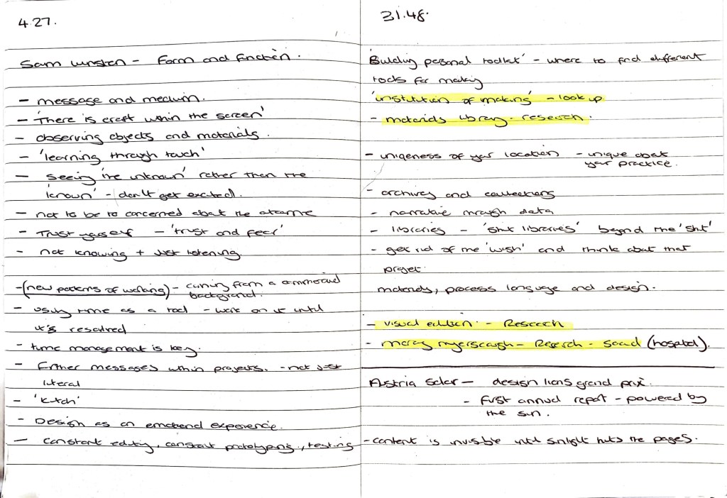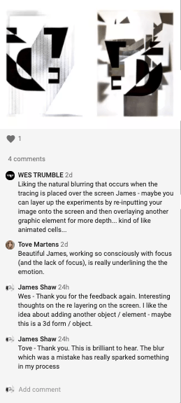 Going into next week: Not to force digital means if it doesn’t feel right. Continue to work in a way where I feel creatively challenge and am exited about what I am creating. Continue to get peer feedback – this has benefited me this week and helped me progress my work in different ways.