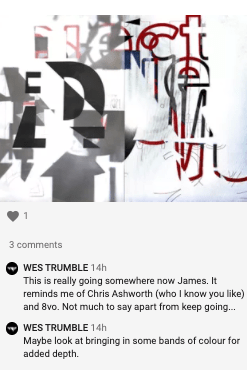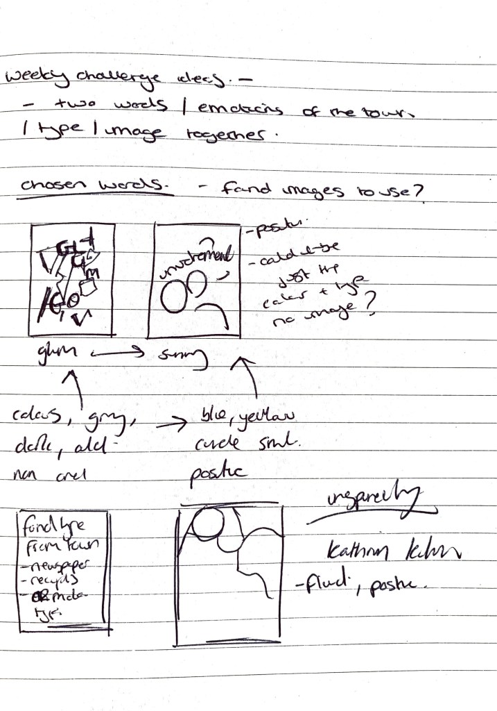 James & Alli – Spoke with Alli this week at this stage of development. Great references shared. Alli spoke about continuing to push my analogue work and pushing my typography by hand and not by digital. (she felt the digital typography took away from what I was trying to communicate) Which I agree with, I was forcing myself to go digital.