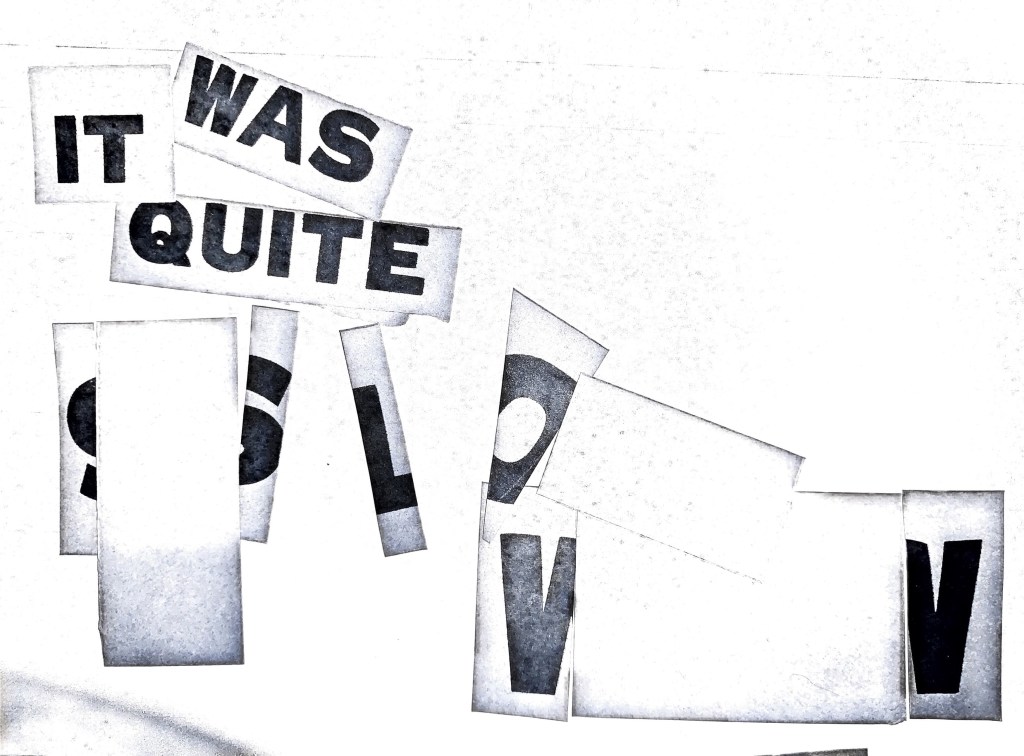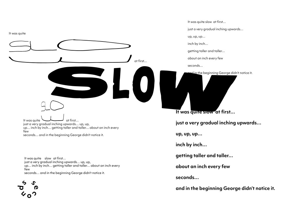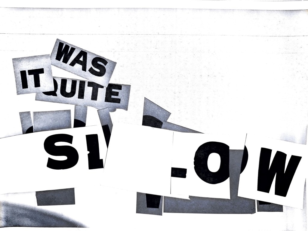 Exploring how cutting up and re arranging the type by hand would look. I introduced blank spaces between the ‘SL and ‘OW’ of ‘Slow’ to create that sense of slowing down and space to take the word in, it always caused a break in the text.