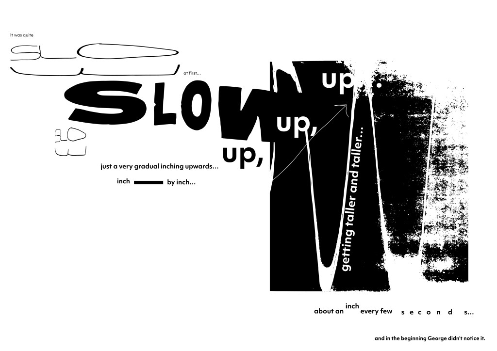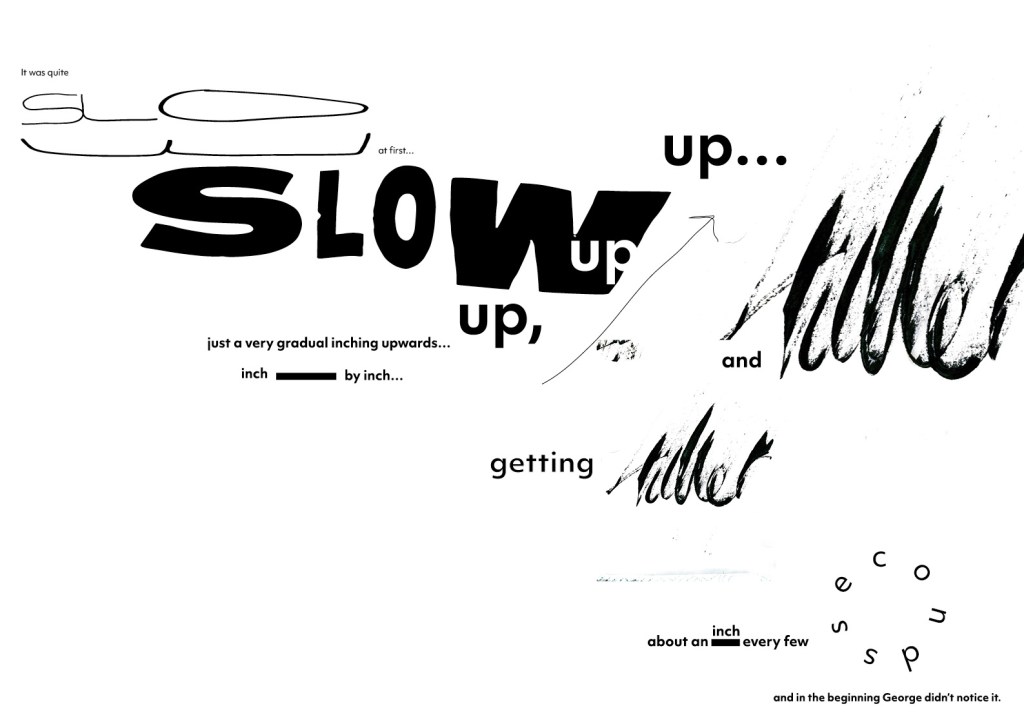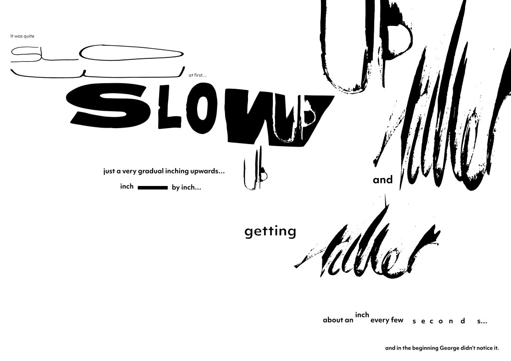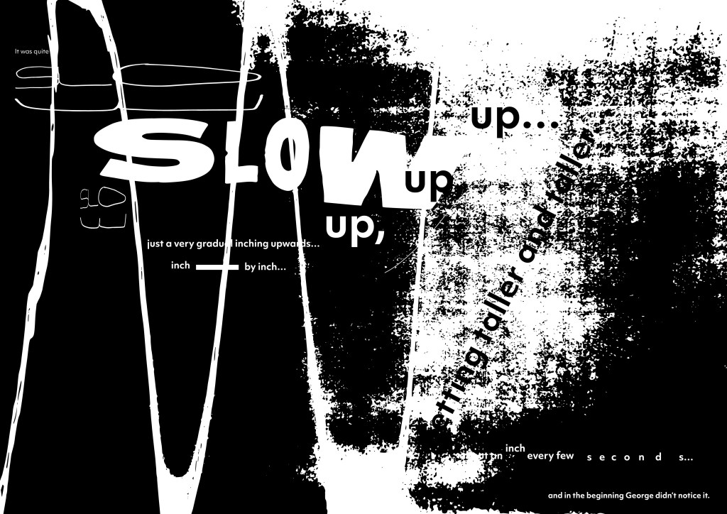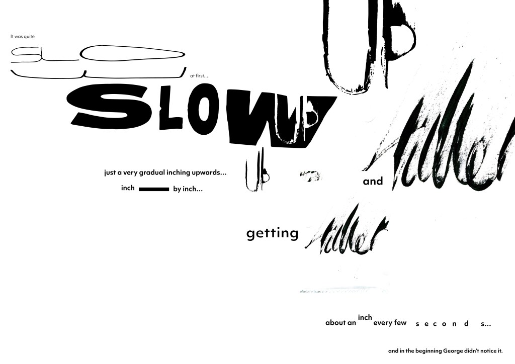 These for me are working really well, something interesting about the space between the letters. Could this be worked across the full excerpt of text? Again could adding colour bring this more to life? Monotone dulls the story down, however it does add that element of slowing to it.