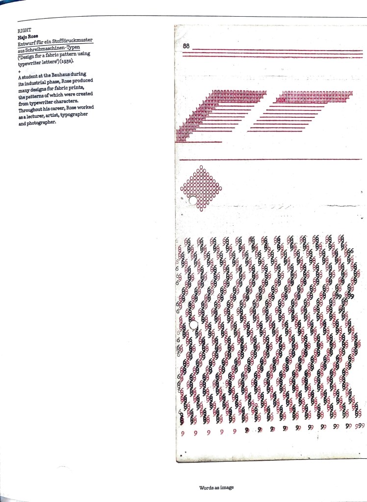 From the book ‘Typewriter Art: a modern anthology’. Typewriter forms composed into delicate, meticulous compositions. It’s the detail and placement which drew me in. What I most like is the typewriter was a machine used before the keyboard so to have these beautiful compositions raises a few questions around the rise of digital. We have lost a portion of craft within design but designers like Hajo Rose continue to celebrate this. I can see these simple forms and structures being applied to words or creating letters within themselves. The top two red designs look like an ‘e’ and ‘t’