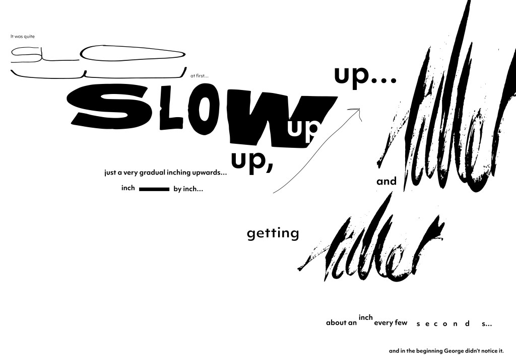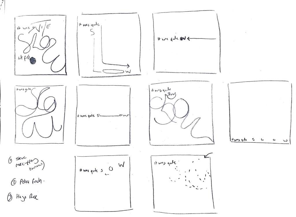 Below – Further experiments with hand drawn type and letterpress. Again thinking about how the ‘slow’ can be a journey for the viewer. I think what works well here is the contrast of experimental typography to the simple start and end words? The balance works.
