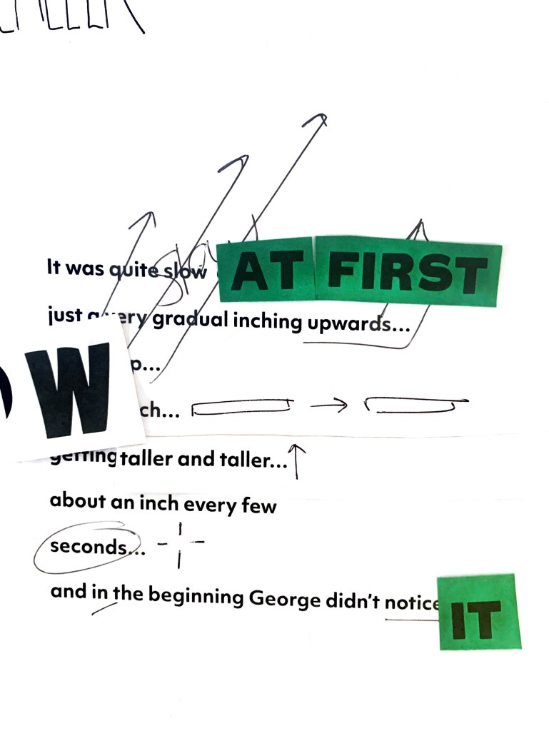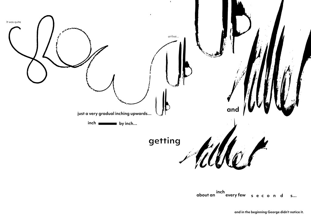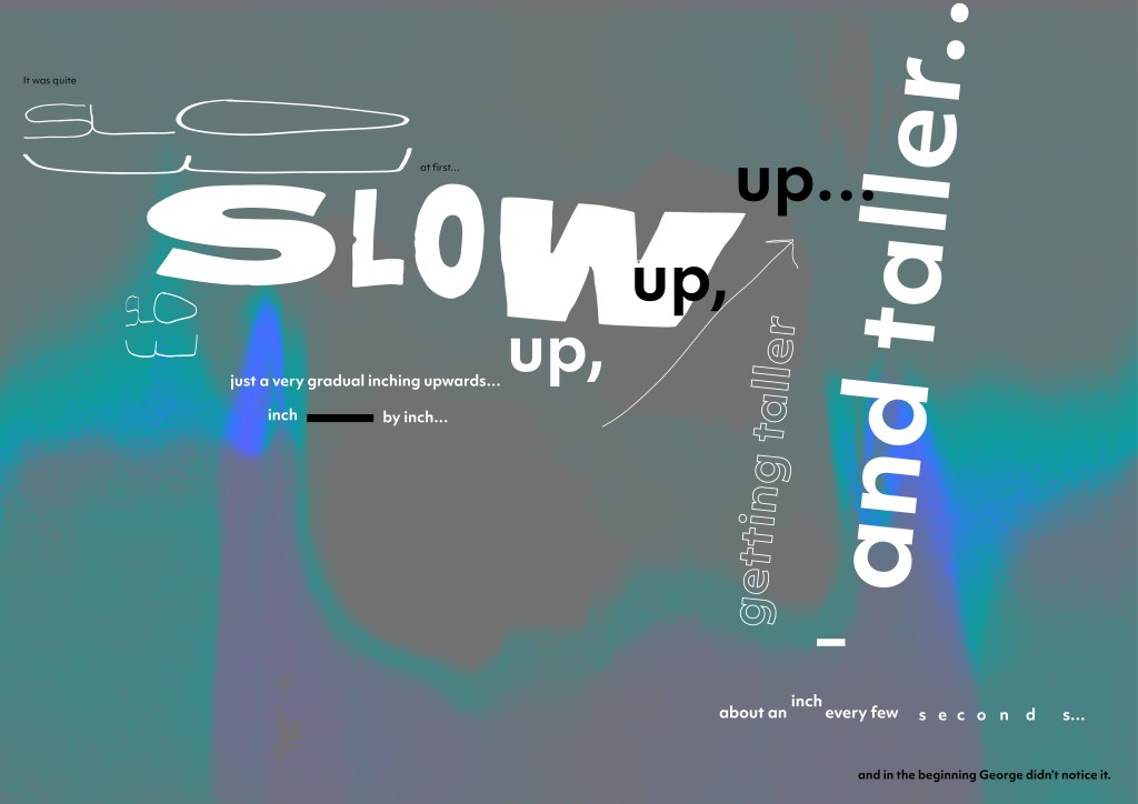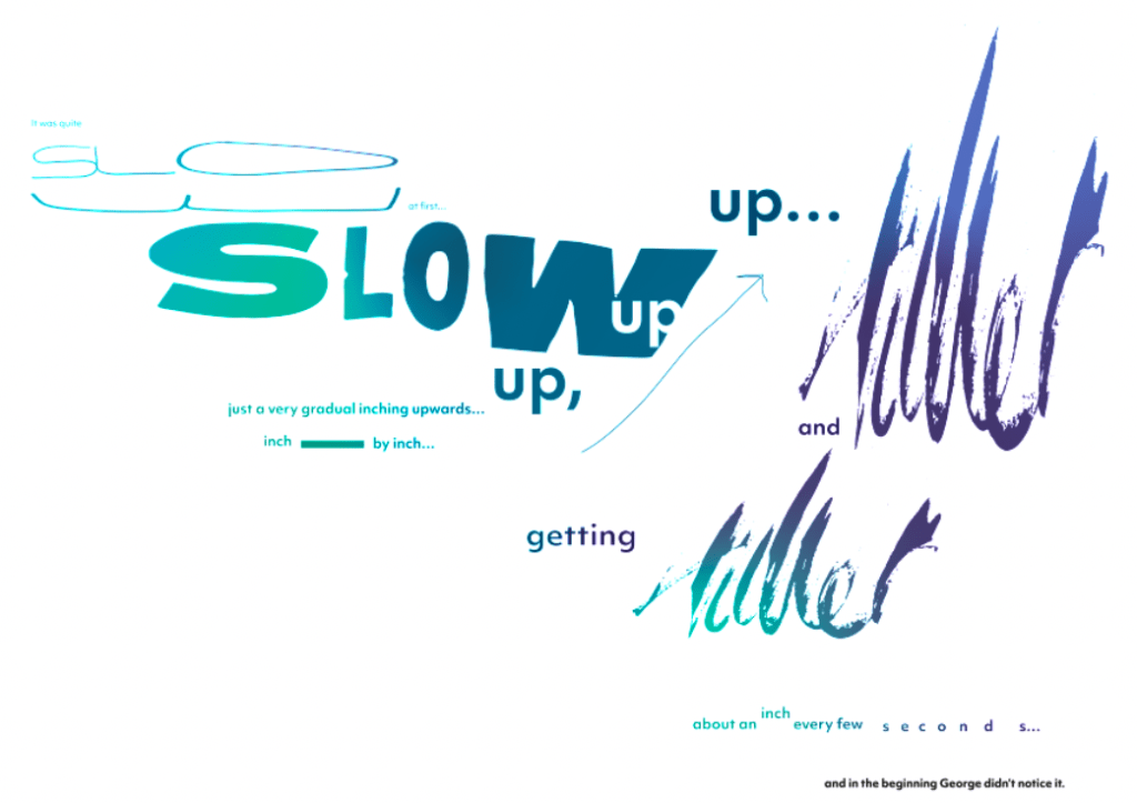 Development of full excerpt – Here I have taken the full excerpt and started working on it as a whole piece, starting to introduce colour and texture. Inspired by the work of David Carson. These recent developments are really starting to work however I think they can go further? Could I use a different typeface? Could I hand write elements of it? Could parts of the text be more expressive? for example could the ‘taller, taller’ feel like it growing? letter by letter?