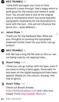 Ellie mentioned that the black and white worked but made a good point about how the story is ‘marvellous and ‘experimental’ – I want to start working with colour / backgrounds going forward with this challenge, I feel it will help elevate the overall design?