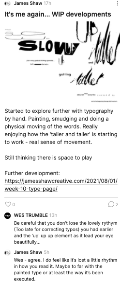 Wes commented he appreciated the application of colour but felt the gradient applied was the wrong shape and motion. Wes suggested making the gradient more in flow with the typographic treatment so the whole composition flowed. – This is something I want to explore into the future when developing this series as I think colour could elevate if used correctly.