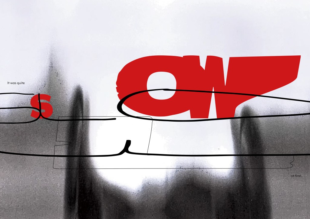 In the above experiments I am really pleased with how they are working. I have continued to work with no colour as it just doesn’t seem to work / looks clumsy. I experimented with a texture in colour before but I am not sure what it’s purpose was? I think if colour was to work if would be within the text and jump out? At the moment I don’t see the need for colour? the expressive use of type gives of emotion and tension in areas.