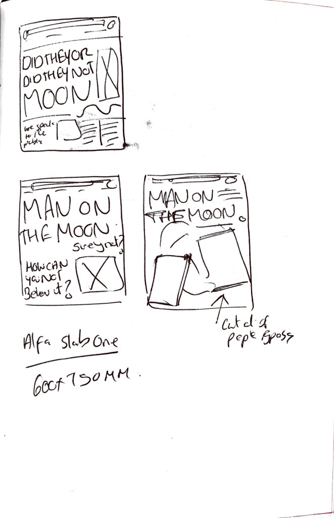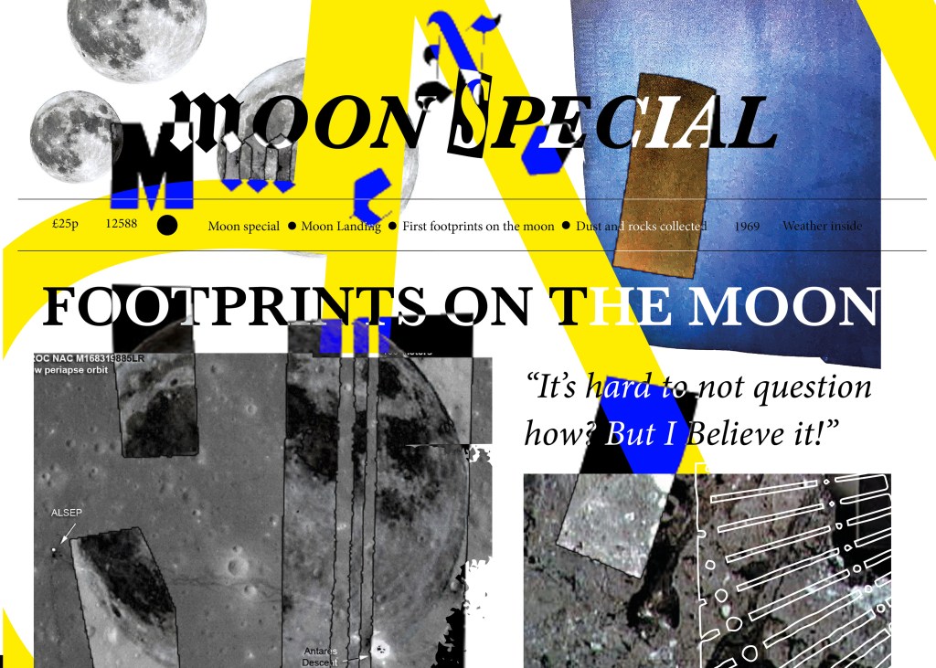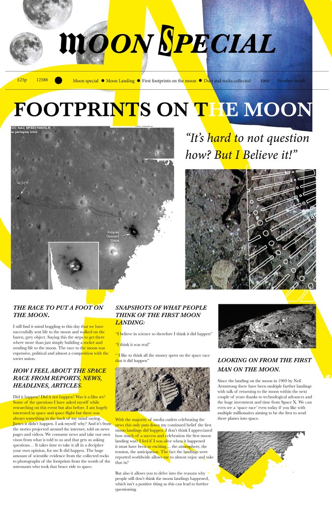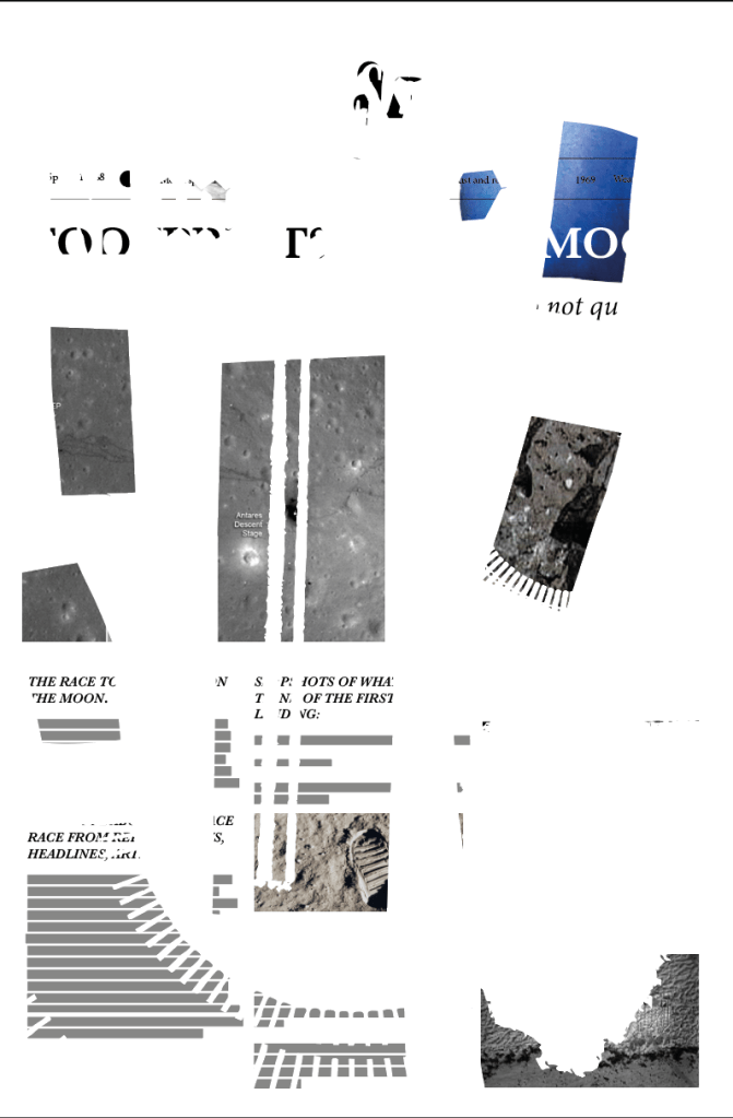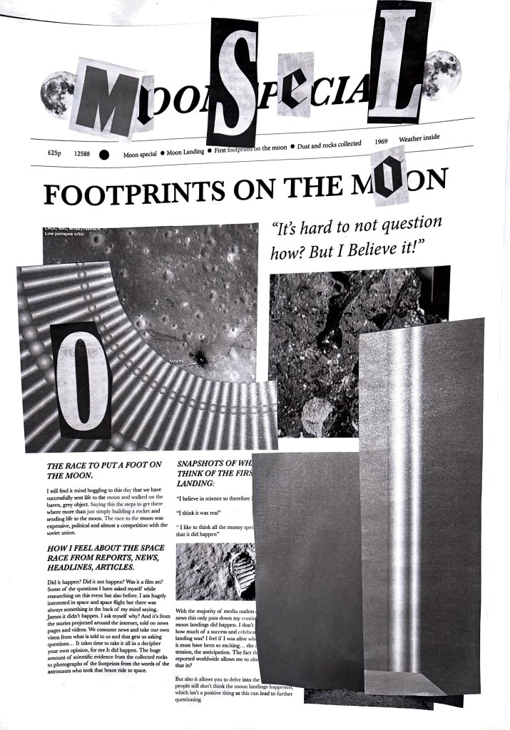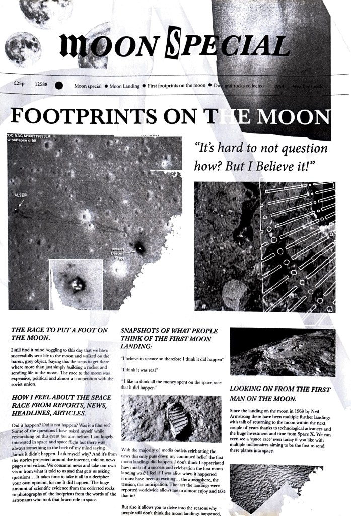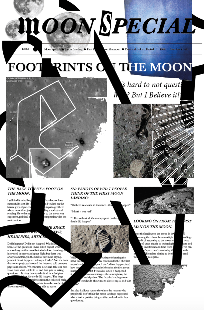 Editorial: Again not my best week as haven’t had as much time as I would like. I wanted to stick with a newspaper theme for this week and create a front cover for my critical review. I think it’s success lies in the pulling apart, deconstructed, found parts (nod to the rocks, parts found on the moon) BUT I think this could go much much further. I would like to rip it up further, introduce hand writing, maybe even make a separate cover for the paper and make the editorial the inside page?