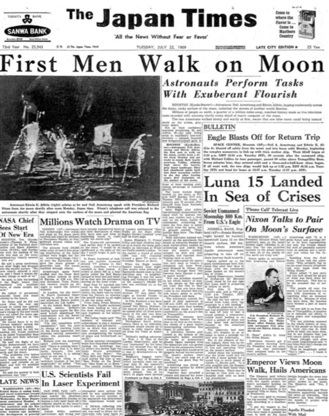 Newspapers from around the world after the moon landing in 1969. Newspapers from New York, UK, Japan, Germany, France, New Zealand covering the story across the full front cover.
