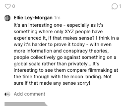 Ellie – I agree. There is only a handful of people who have actually been there and actually stepped on that surface. The ‘conspiracy’ was started by a man and that has led to all these questions to date and got people still seeking for ‘real’ evidence it happened even though they returned with pounds of rocks, dust and matter from the surface of the moon. I find your point on collectively going against something on a global scale interesting. Going to explore into this further, thank you for your feedback.