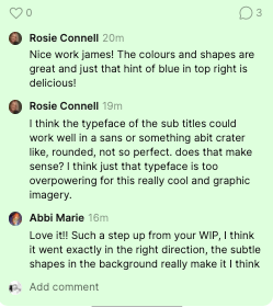 Over the past few weeks I have really pushed into new areas but I feel this week is slightly lacking. But I can’t always be on and sometimes you need week’s where it fails to understand what doesn’t work. It always help see what I don’t enjoy working on as much? Thoughts can be taken into the future beyond the masters here. (brining into someone to support on words/copy) COLLABORATION!!