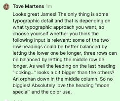 Tove made some constructive comments around the typographic treatment I had gone with. These inputs I am going to look over and implement and I feel I rushed this area. Agree with the Tove on the balance o the columns and headings.