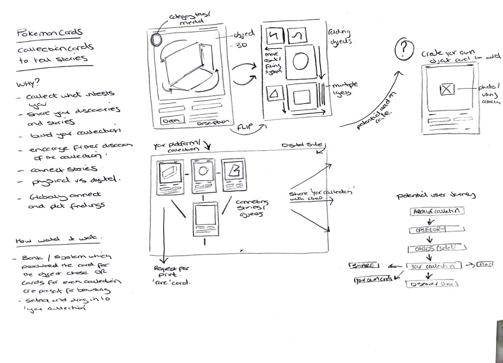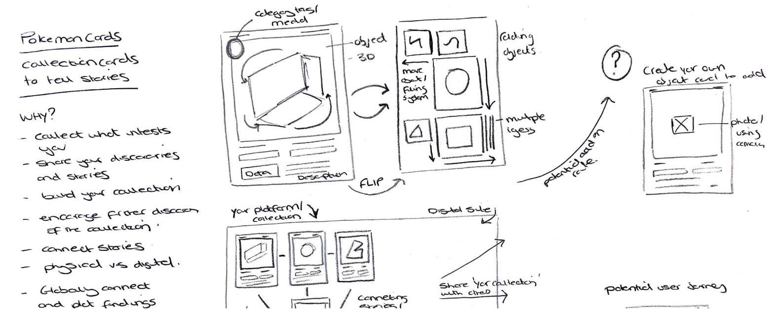 Have this idea of creating a concept which allows the user to create their own object story collection using ‘digital cards’ Inspired by research around interactivity and nostalgia I wanted to explore a ‘Pokemon type’ idea around card collecting. This encouraging discovery and connection of stories.