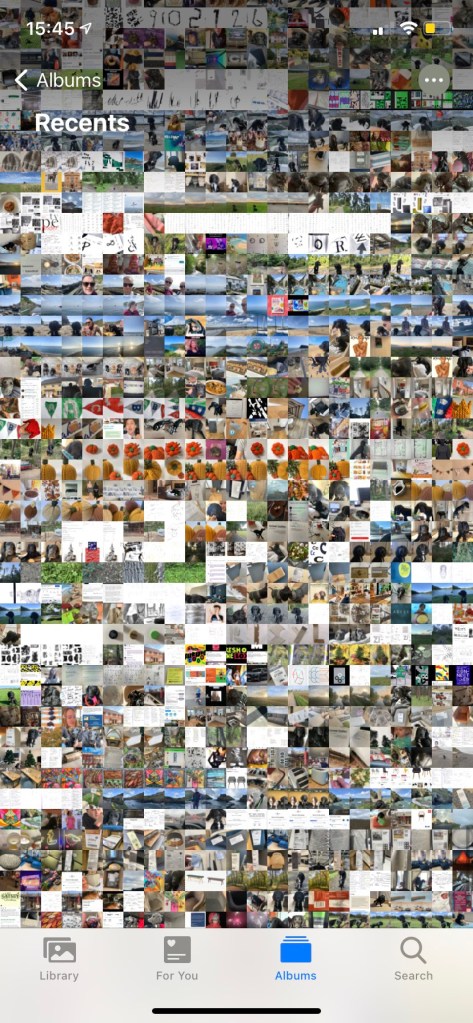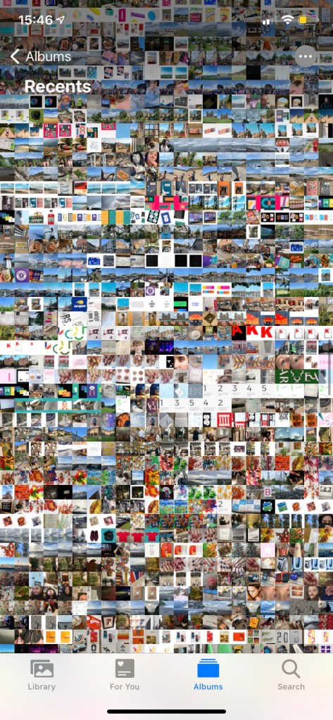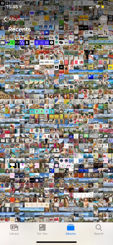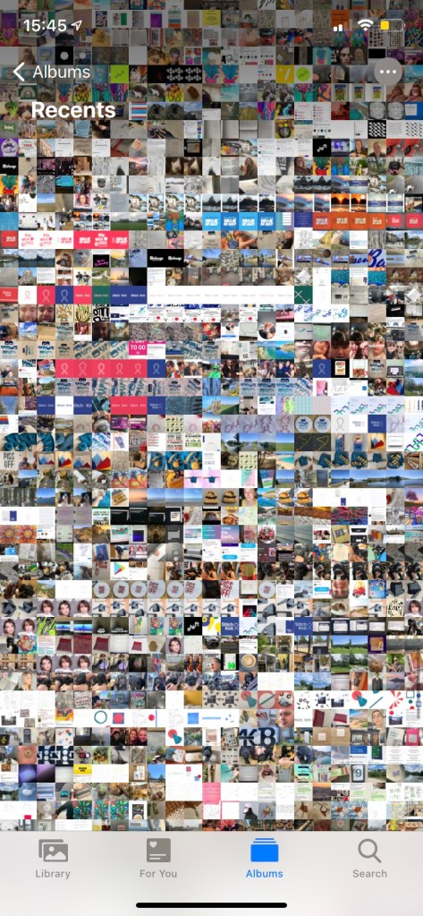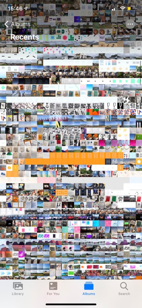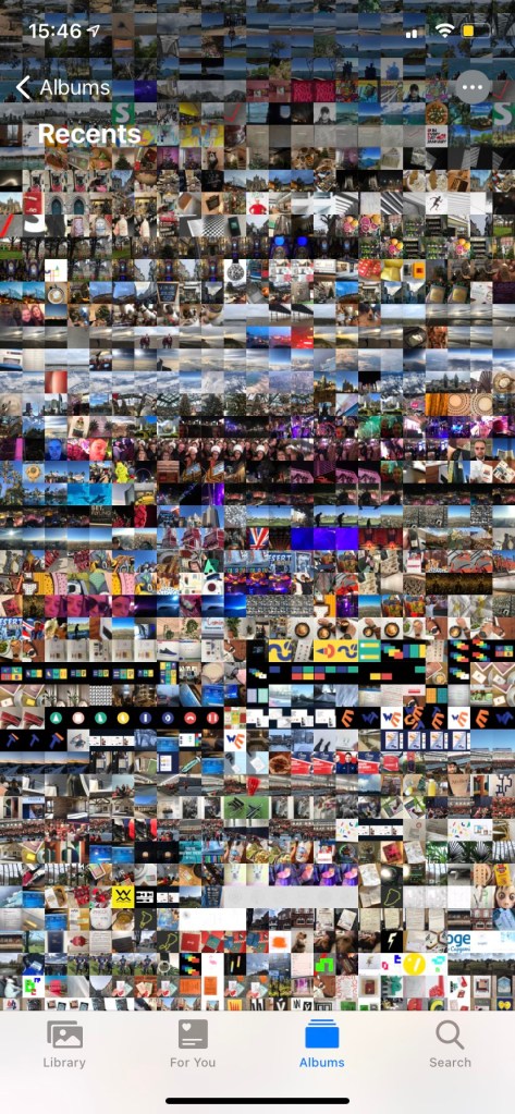 Photo album in my iphone providing a visual collection of my captures. Could this format be included within my app? What surprises me the most is the colours across the different rows. Each showing a different mood or emotion? There is consistent areas (showing time in a place for a period of time) and then areas which are more chaotic with different colours all over the place.