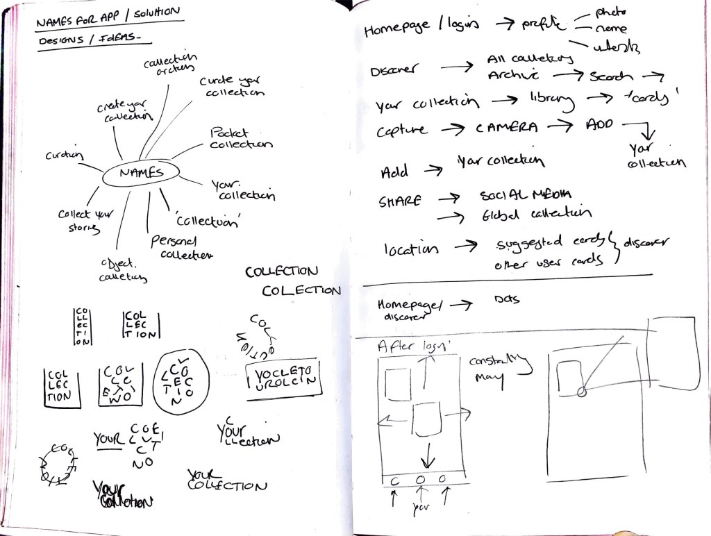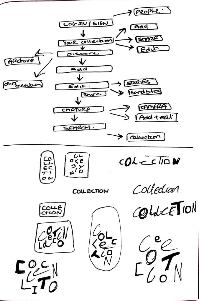 Initial logo sketches for the app name ‘Collection’ Looking at how the letterforms can create a sense of different objects, different collections, individual for every user. Idea of creating letterforms which are all unique. Maybe these change depending on the user? Could there be coding which allows the app to auto generate the letters for the user. Creating their own collection logo (instead of a profile image)