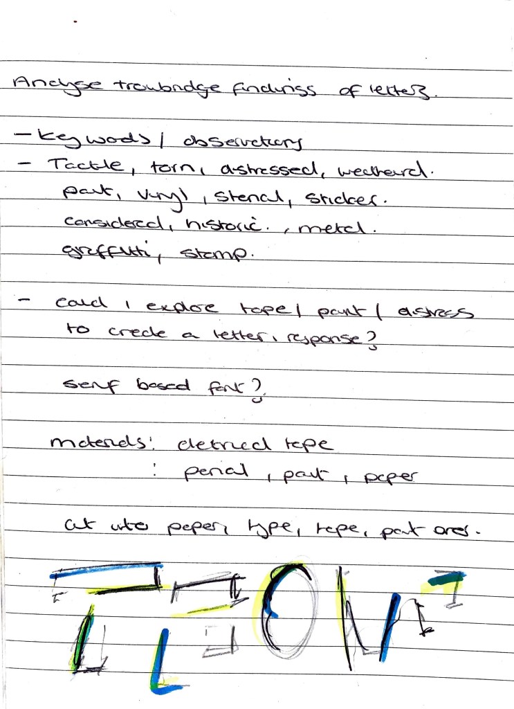 Initial thoughts from analysing letterforms found in location. Considering key words, materials and application. Through observations I have started to think this will be an experimental but evolving font? Distressed in areas to show the town’s current known status and visual appeal but also areas of structure / material to highlight the towns silk / woolen history.