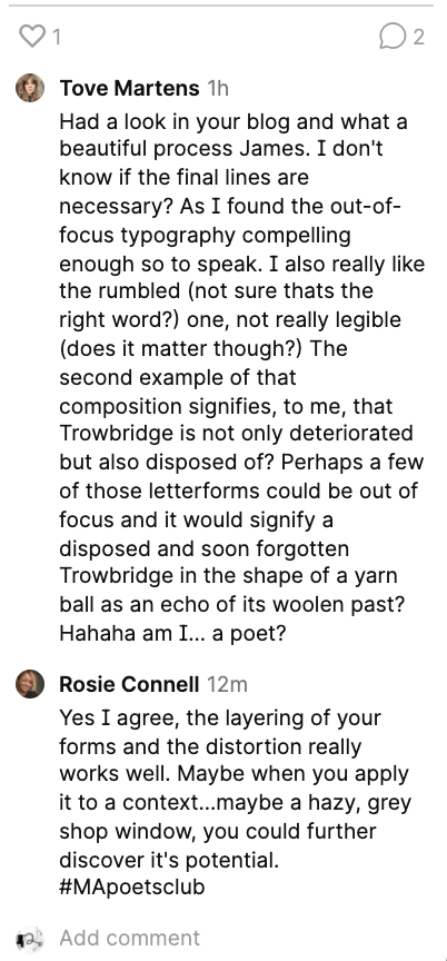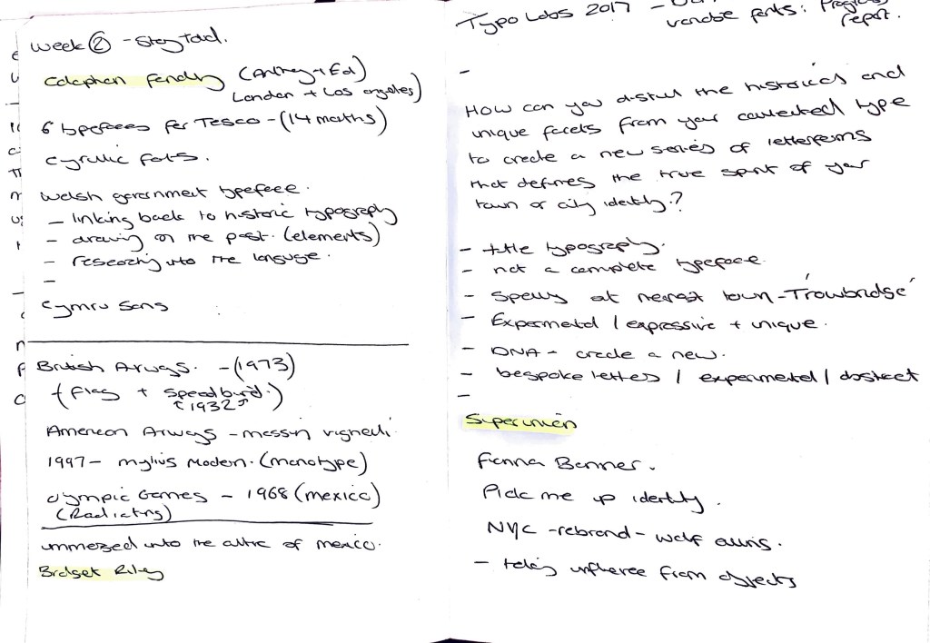 Rosie comments on the context side of the title, saying once applied to a surface could this enhance the identity and overall feeling? I am going to explore a set of juxtapositions of the title typography on location within the town.