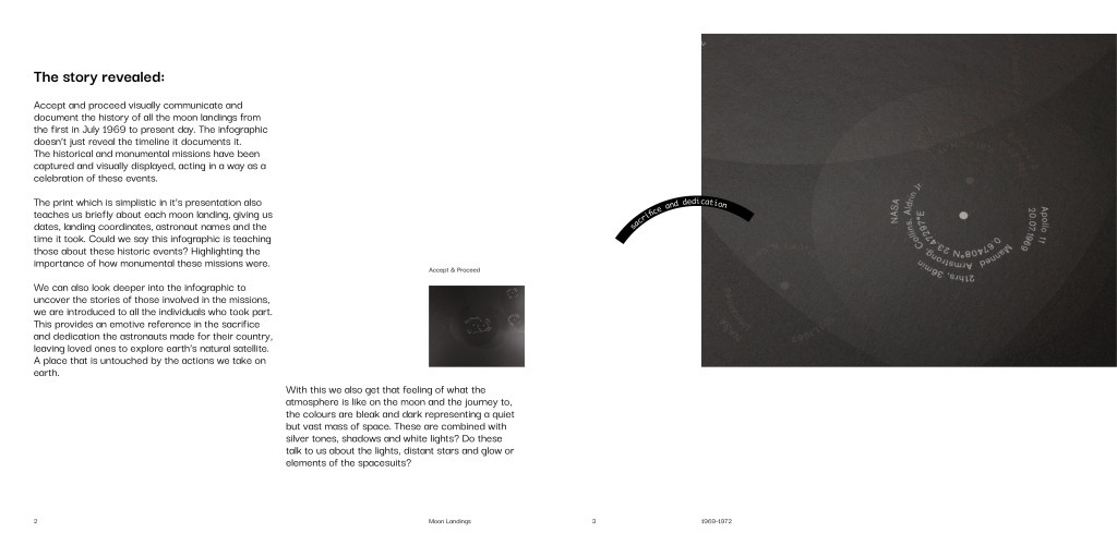 On first viewing I thought it was quite simple in its execution however the carefully considered and constructed graphic has been meticulously planned and presented. Its eerie glow, casting over the graphic, reminds me of the moon on a clear night sky against the vast black solar system, adding to the truly epic journeys these astronauts made.