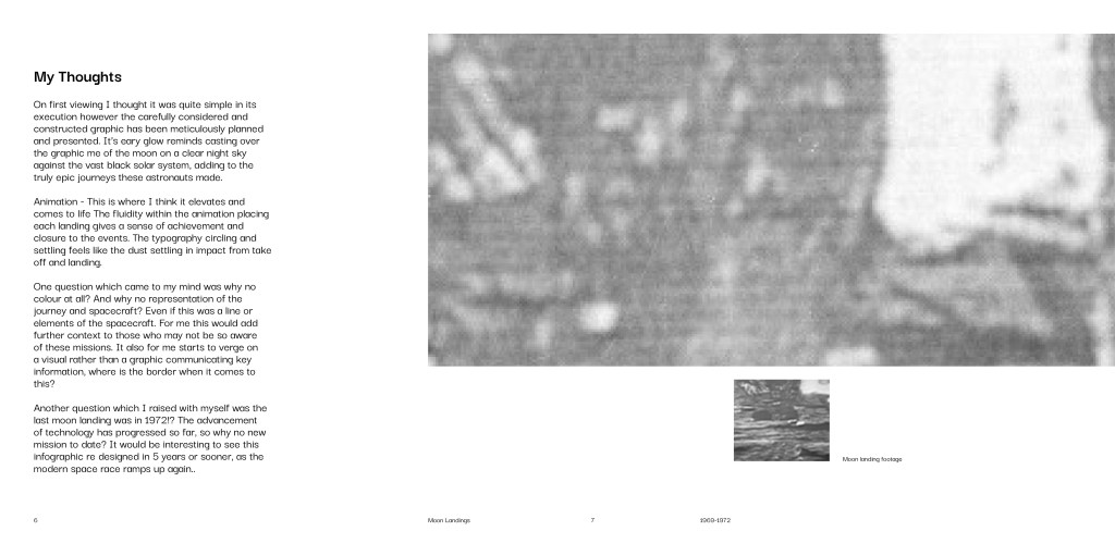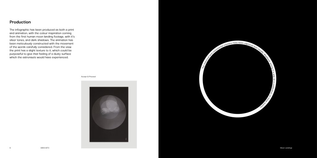 The stories of those missions has been captured within this graphic, making it a personal and emotive piece. Documents the journeys taken and those involved. How little we have been to the moon recently? With technology advancing why have we not been to the moon more?