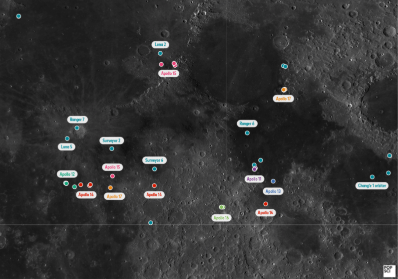 What works here is the photograph (real location photo) simple dots and text boxes. This graphic makes it so clear and easy to read and see the location. What I think would elevate this is if we could see the whole moon and where these sit? This would show the scale of the moon and the scale of the objects. Here the objects look massive on the moon’s surface.