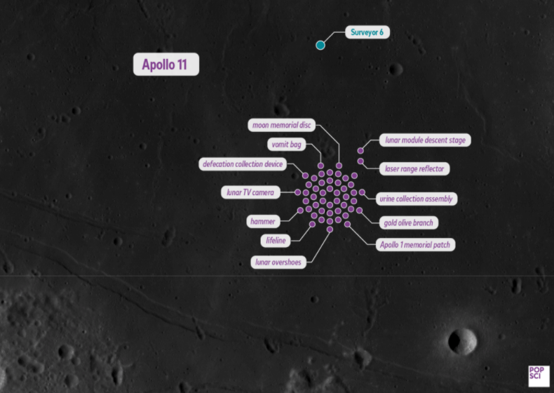 Mundane information made interesting. This infographic explores the items left on the moon from the missions which landed there. They go into great detail on location and what object was there. These have been documented by NASA in the Manmade materials left on the moon catalogue
