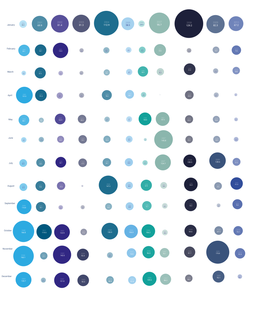 What is clear here is the drier months but also the drier years, you can then go away and research those years and see if there was a drought / heavy rain / flooding that month / year in relation to the size of the circle.