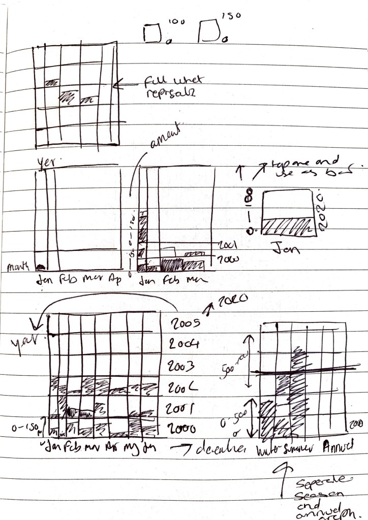 Right hand page page I’m starting to look at a grid based system which can be filled in relation to the data available from the Met Office. Going off a structure of a bar graph in terms of axis.