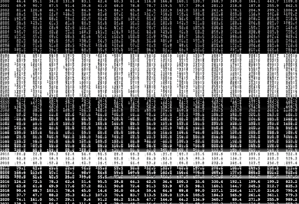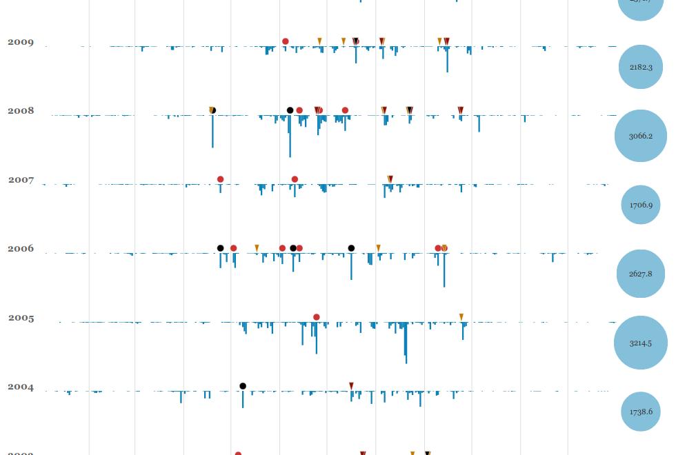 Original data provided. Experimented with visual presentation. Not an infographic more of a visual / mash up of data. Almost trying to create that sense of rainfall, at mass.