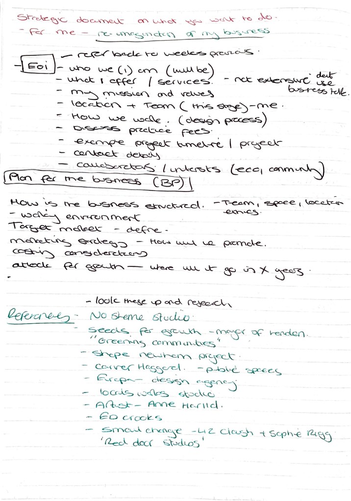I firstly started this process off by trying to write a business plan but this wasn’t working (notes below) I soon realised that this re discovery of design for my practice needed to be taken in a different direction.