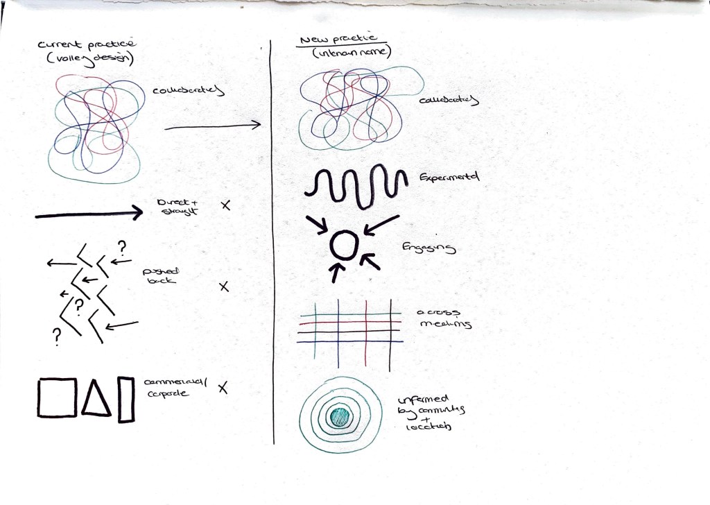 Visual overview of how elements of my old practice and new practice look. Noticeable new practice is a more involved way of working, letting the merge of artist and designer come together. This allowing for more of a experimental approach to design and drawing upon ethnographic ways of researching.