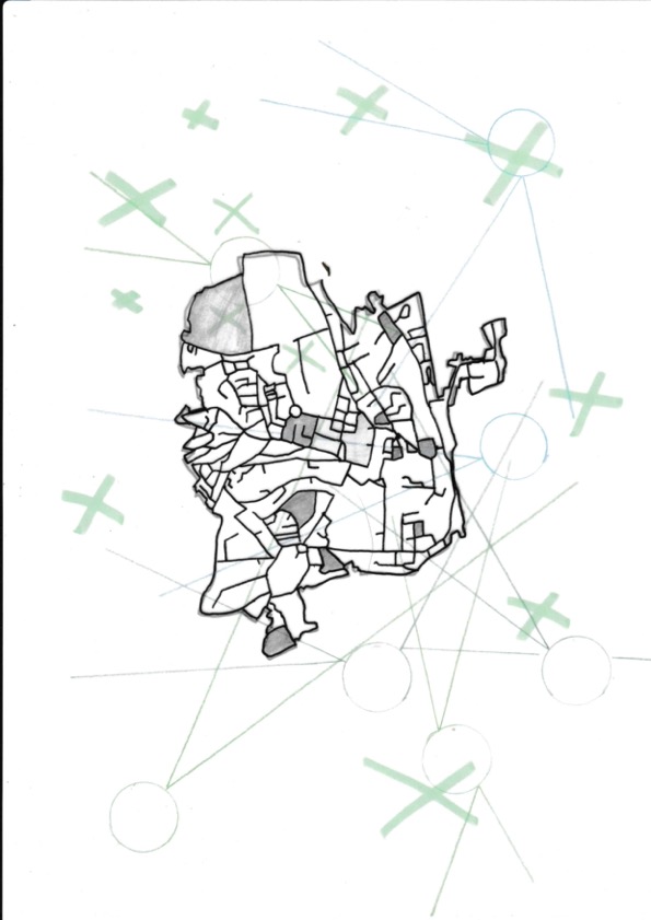 Visuals below are rough explorations of this thought. With the green areas being projects speculatively happening within a community now and less so in the central more compacted area. But slowly seeing the outer areas influencing decisions.