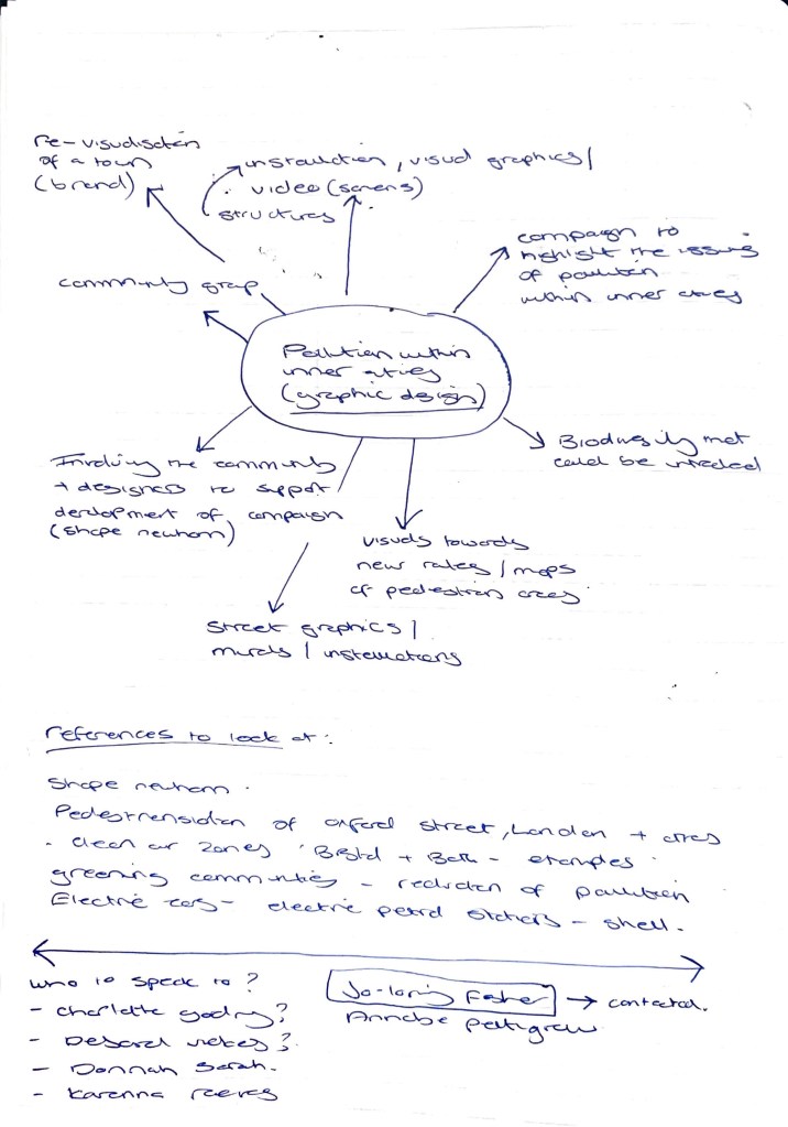 The conversations I had brought up a number of interesting ideas / thoughts especially around project ideas outside of Graphic Design, including the amount that is taught within schools for example. But also project ideas came up around signage, books and advertising. Each individual I spoke to had a different approach which was the best part, Each had a different idea of what pollution is and what it means within a city landscape. This is where us as designers could tap into collaborative projects which lead to different approaches and outcomes, connecting with different sectors.