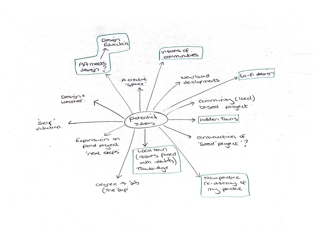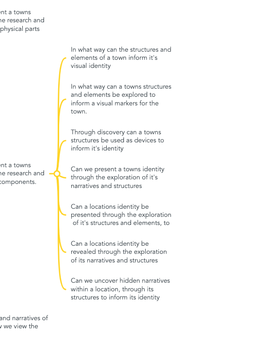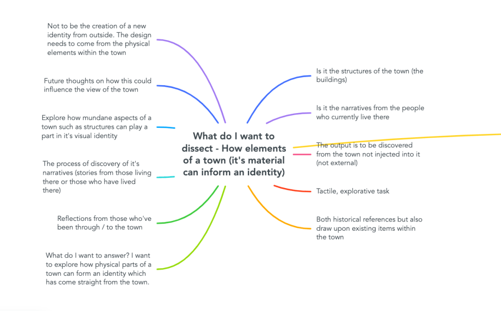 I shared my initial thoughts on my project themes. Around the idea of exploring the structure and voices of a town can provide a identity to the town (with the sense of not having to create one from new) using materials within the location.