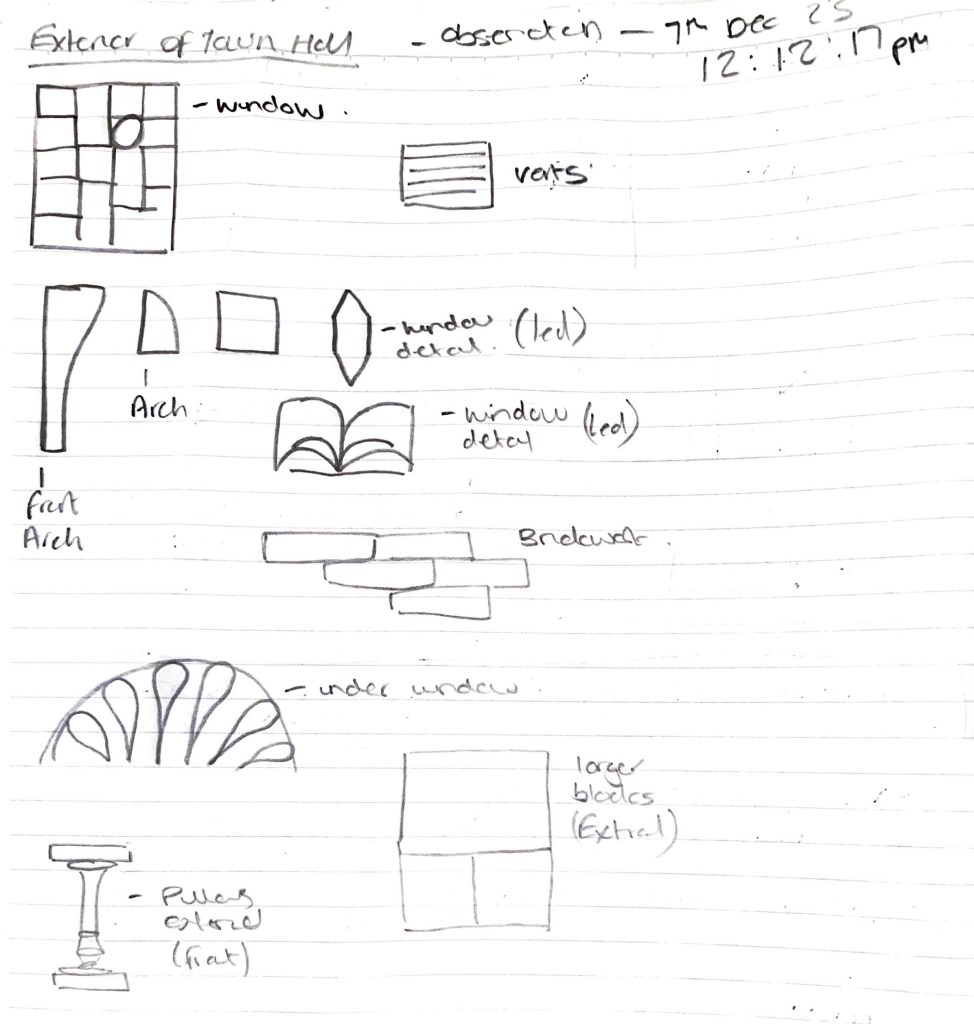 These quick iconography observations were taken from both the Town Hall and Civic Centre in Trowbridge. Observing the external structure and capturing the shapes.