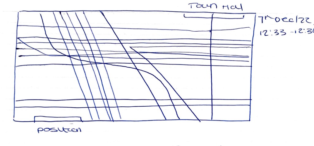 Following on from this I wanted to place myself in a location and observe over a period of time not just the external features of the space but the happenings at certain times. Below is observed shapes from my view point within the coffee #1 across the road from the Town Hall.