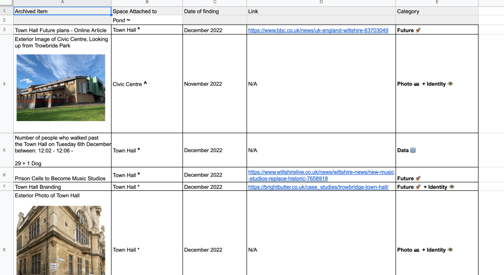 Documentation of my findings. While I’m gathering all of this information I have been thinking about how to keep findings in a document. At the moment I am keeping track of findings (pictures, references, identity) within an Excel sheet which is categorised with all findings from the specific spaces (Town Hall, Civic Centre, Town Pond, Home Mills)