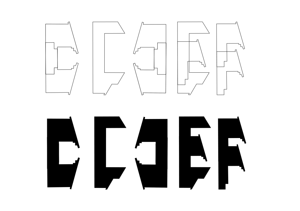 Observations from Civic Centre placed upon grid extracted from exterior experience. Can forms start to be created from this? What if these are the core letterforms which need to be connected and intertwined to make words?
