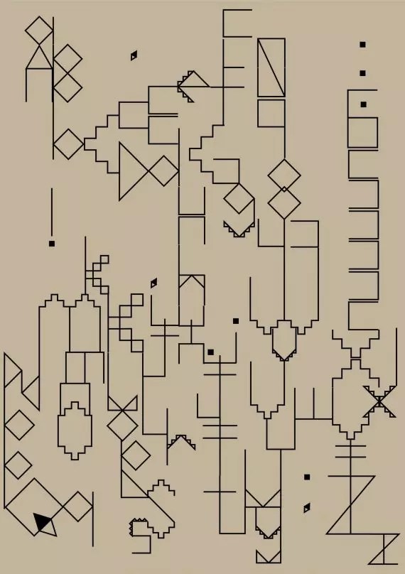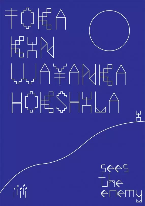 The letterforms stood out for their structured and story led presentation. The Font which comes from forms commonly found in traditional Lakota quill and beadwork.Their construction is pieced together to construct a font which represents the tools used within Lakota communication. They’re not only used for the font but also they’ve been pieced together to create more abstract and narrative led pieces. It’s geometric forms remind me of parts of buildings which have been formed together to construct the font (a whole font could potentially represent one area) and once stitched and collaborated together form narratives.