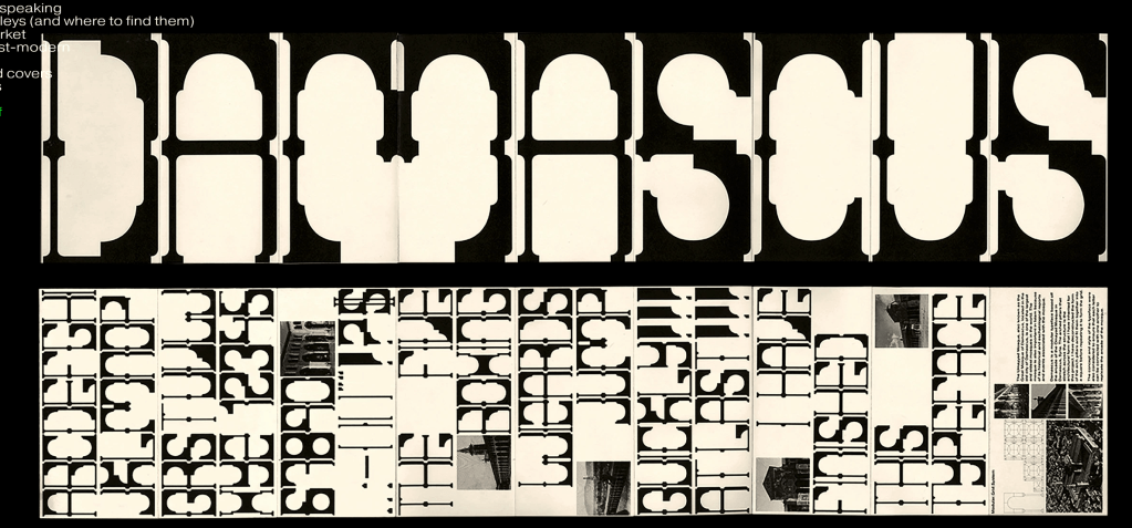Letterforms, cut, collated and presented in a way which leaves the user able to move it around? Create their own view. This is a cover design however Its deconstructed nature has drawn me in. They aren’t full letterforms and they’re accompanied by other forms. A collection of forms found? A narrative which has many routes and outcomes?